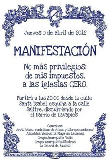 La marcha había sido solicitada por la Asociación Madrileña de Ateos y Librepensadores (AMAL) con un recorrido a realizar horas durante dos horas (cuyo inicio era fijado a las 20 horas) entre Tirso de Molina y la Plaza de Lavapiés.